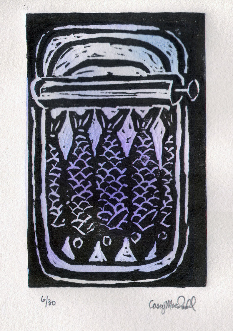 Sardines Published June 14, 2013 at 792 × 1125 in Linoleum block prints ← Previous Next → Sardines, Linoleum block print and gouache, 2013